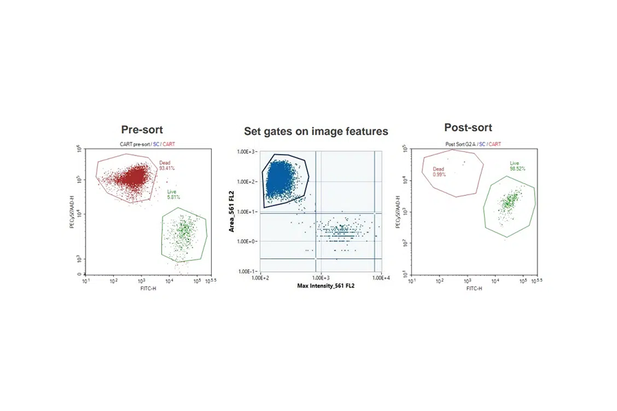 La capacidad de incorporar la información de imagen en la estrategia de clasificación aumenta la precisión de la selección de células. Las características de la imagen, como el área y la intensidad máxima, se calculan en tiempo real, lo que permite empezar la clasificación sin la necesidad de analizar previamente toda la muestra. Esto mejora significativamente la eficiencia y ahorra tiempo en los procesos experimentales.